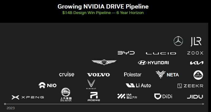 Из глобальных клиентов NVIDIA в этом сегменте следует упомянуть Mercedes-Benz, Jaguar Land Rover, корейский конгломерат Hyundai Motor Group (Hyundai, Kia и Genesis), шведская Volvo в силу своей принадлежности китайской компании Geely Auto может вставать в один ряд с родственными марками Lotus, ZEEKR и Polestar. Китайский автоконцерн SAIC в этом списке имеет отношение к маркам Roewe и IM Motors, конкурирующий BAIC упоминается под собственным именем, тройка молодых конкурентов Tesla в него тоже попала: Li Auto, NIO и XPeng. Особняком стоит не столь известная за пределами Китая марка Neta, а вьетнамский автопром представлен компанией Vinfast, которая свои электромобили уже экспортирует в США.