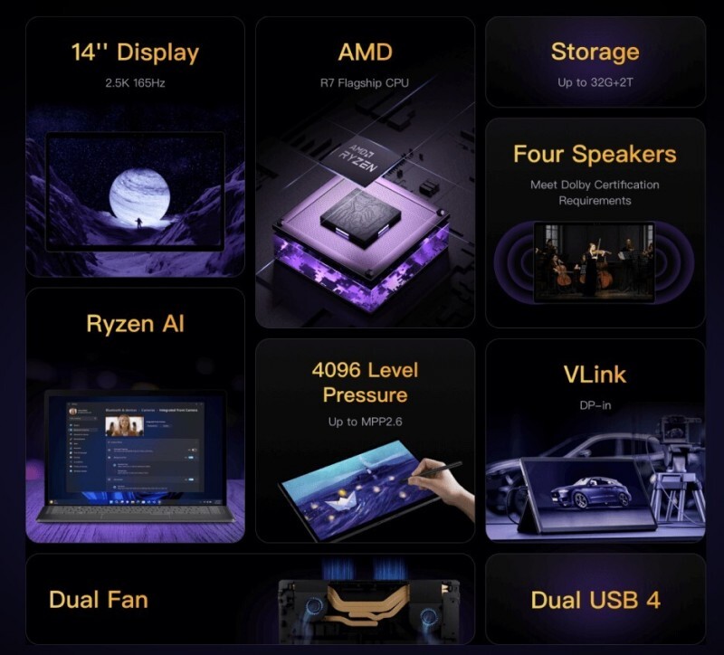 Среди стандартов связи представлены Wi-Fi 6E и Bluetooth 5.3, USB-C V-Link (вход DP), два USB4 40 Гбит/с, сканер отпечатков и 4-контактный разъём для гарнитуры. Устройство работает на процессоре AMD Ryzen 7 8040U Hawk Point с 32 ГБ памяти LPDDR5-6400 и SSD M.2 Gen 4 NVMe объёмом 2 ТБ. Мощность процессора равна 28 Вт. Для охлаждения применяются четыре плоские медные тепловые трубки и два вентилятора. Ещё есть четыре динамика и разнонаправленный микрофон.