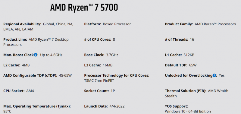 Компания AMD готовится обновить линейку настольных процессоров не только новыми APU серии Ryzen 8000G для платформы Socket AM5, но и несколькими новыми SKU для AM4. Возможные цены на многие из этих чипов подробно описаны в нашем недавнем отчете. Среди перечисленных чипов есть загадочный новый процессор Ryzen 7 5700 для Socket AM4. Хотя у нас нет информации о его цене, AMD незаметно разместила информацию о продукте на своем сайте. На странице продукта компания утверждает, что он выйдет в апреле 2022 года, но так и не появился, по крайней мере, в розничной продаже.