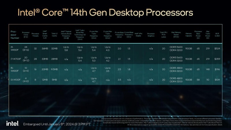 В настольном сегменте представлено 18 новых моделей с базовой мощностью 65 или 35 Вт, в последнем случае процессоры отмечены индексом T. Лучшими 65-ваттными процессорами являются 24-ядерные 32-поточные Core i9-14900 и 14900F, а лучшей 35-ваттной моделью — 14900T.