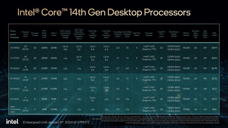 В основном процессоры получили более высокие частоты, выделяются лишь различные варианта Core i7-14700, которым увеличили количество ядер. Как и прежде, самые младшие модели, Intel 300 (преемник Pentium G7400) и Core i3-14100, предлагают 2 и 4 P-ядра соответственно с поддержкой технологии HT.