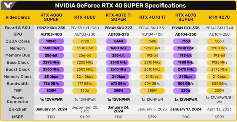 На фоне приближающегося дебюта новых моделей видеокарт NVIDIA, которые станут частью линейки GeForce RTX 40 SUPER, в сети появились подробные спецификации предстоящих новинок.