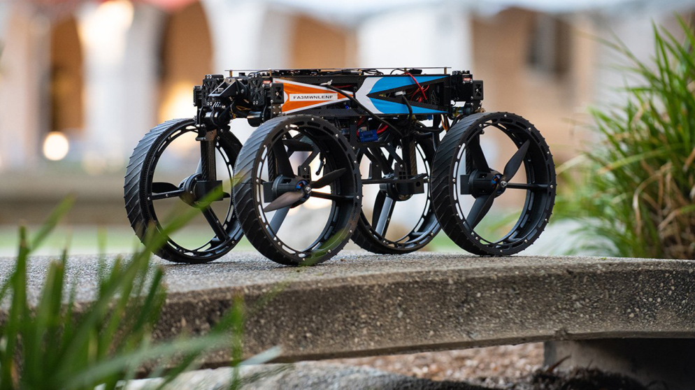Шарнирно-сочлененные колеса являются ключом к универсальности M4. Когда он не летает, робот может регулировать угол наклона колес, чтобы проползать под низкими препятствиями. Он даже может использовать колеса как ноги, чтобы проползать под препятствиями, которые мешают ему катиться. Команда также черпала вдохновение в том, как четвероногие животные встают на задние лапы — M4 может делать то же самое, балансируя на задних колесах, чтобы видеть препятствия. К тому же команда ловко использует пропеллеры для стабилизации робота при выполнении гимнастических упражнений.