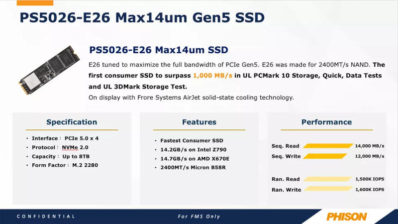 Phison недавно показала один из самых производительных SSD в мире — PS5026-E26 Max14um Gen5. Его скорость чтения составляет больше 14 Гб/с, а записи больше 12 Гб/с. Такая производительность твердотельного накопителя обеспечивается благодаря обновленной прошивке, а также новой инновационной системе охлаждения компании Frore Systems.