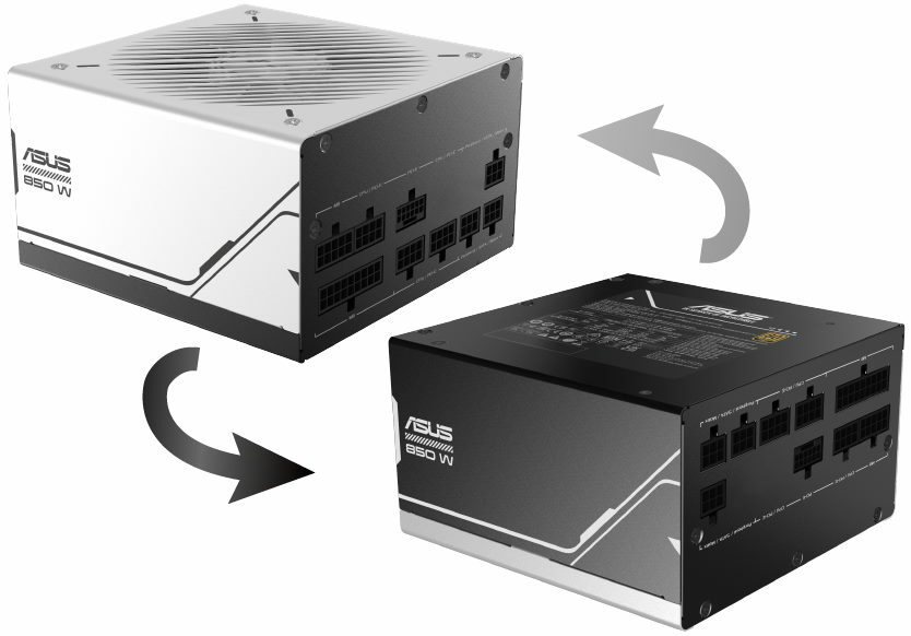 ASUS придумала простое и интересное дизайнерское решение, окрасив одну часть блока питания в белый цвет, а другую — в чёрный. В зависимости от преобладающего цвета сборки, пользователь может расположить блок питания либо белой, либо чёрной стороной. В этом случае меняются условия охлаждения, воздух забирается сверху или снизу соответственно. В блоках питания используется 135-мм вентилятор на двойном шарикоподшипнике, полупассивный режим не поддерживается.