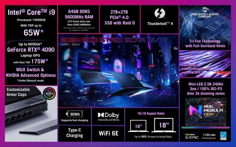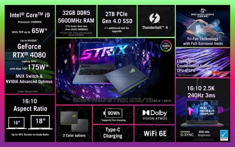 Бренд ASUS Republic of Gamers (ROG) анонсирует серию ноутбуков Strix 2024 года с 18- и 16-дюймовыми моделями Strix G и Strix SCAR, сообщает TechPowerUp. Все новинки оснащены флагманским 24-ядерным процессором Intel Core i9-14900HX, мощной дискретной графикой NVIDIA, 2,5K 240 Гц дисплеями и используют жидкий металл Conductonaut Extreme в качестве термоинтерфейса для центрального и графического процессора.