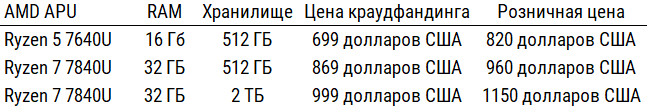 Если цена младшего GPD Win 2 на платформе Indiegogo составляет 699 долларов, то в рознице конфигурация с 6-ядерным AMD Ryzen 5 7640U, интегрированной Radeon 760M, 16 ГБ оперативки и 512-гигабайтным твердотельным накопителем будет стоить от 820 долларов США. Более производительные конфигурации с 8-ядерным Ryzen 7 7840U и Radeon 780M на краудфандинговой площадке предлагаются по цене 869 и 999 долларов за варианты 32/512ГБ и 32ГБ/2ТБ соответственно. В рознице эти конфигурации будут стоить от 960 и 1150 долларов. Подробнее с устройством можно ознакомиться на официальном сайте.