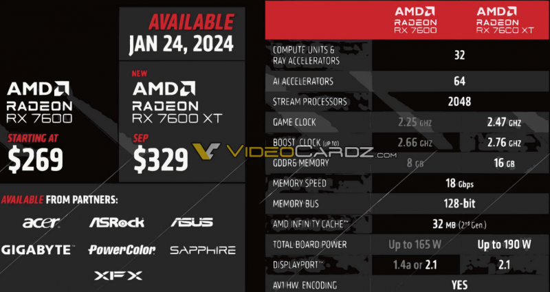 Новая карта AMD получит то же количество ядер, что и RX 7600, и поступит в продажу 24 января по цене 329 долларов