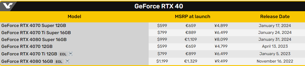 Заметно, что ещё в прошлом поколении Дженсен Хуанг выпускал новинки, ориентируясь на те или иные решения Лизы Су. Похоже, в какой-то момент даже главе NVIDIA стало очевидно, что ожидать от красных реальной конкуренции не приходится. AMD всё ещё выпускает видеокарты, но делает это нехотя, а количество доступных товаров этой компании в рознице сильно сократилось. Что же, деньги сами себя не заработают, а уже в январе геймеры получат возможность купить 3 неплохие видеокарты, которые были вчера представлены в рамках CES 2024. Речь идёт о линейке GeForce RTX 40 Super, о которой мы с вами вчера уже говорили. Повторим немного теории в конце данного материала, а пока остановимся на любопытных слухах, которые появились сегодня. По данным инсайдеров, релиз новой линейки не будут вписывать в уже готовые решения, ведь в этом случае пришлось бы снижать цены, а делать этого никто не хочет. Вместо этого NVIDIA решила вывести с рынка GeForce RTX 4080 и GeForce RTX 4070 Ti. Обе видеокарты на официальном сайте получат статус EOL (End-of-Life), а их производство уже остановлено. Таким образом не будет никакого внутреннего каннибализма, о котором так много вчера писали эксперты. GeForce RTX 4080 Super и GeForce RTX 4070 Ti Super просто встанут на место указанных выше продуктов, предлагая немного больше возможностей без ценовых колебаний.