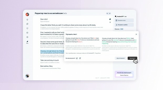 Нейросетевой редактор будет полезен, если, например, нужно написать письмо иностранному коллеге, подготовить доклад или пост в социальные сети. YandexGPT предложит улучшенный вариант написанного, не исказив изначальный смысл. Функцию можно применить как на весь текст, так и на отдельные предложения — достаточно выделить нужный фрагмент. Между английской версией и русским переводом легко переключиться и скорректировать результат — оригинал тоже поменяется с учётом изменений.