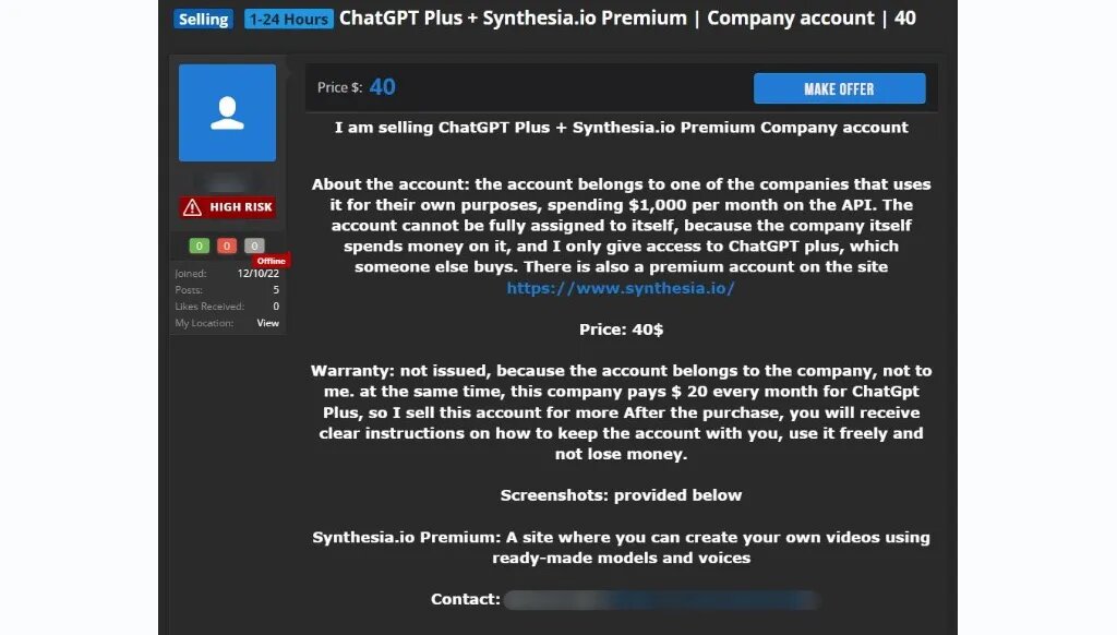 Пример объявления в даркнете, в котором предлагают получить доступ к корпоративному аккаунту в ChatGPT и Synthesia за $40