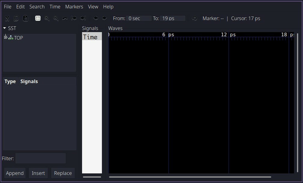 Затем вам будет представлено окно GTKWave, которое выглядит следующим образом: