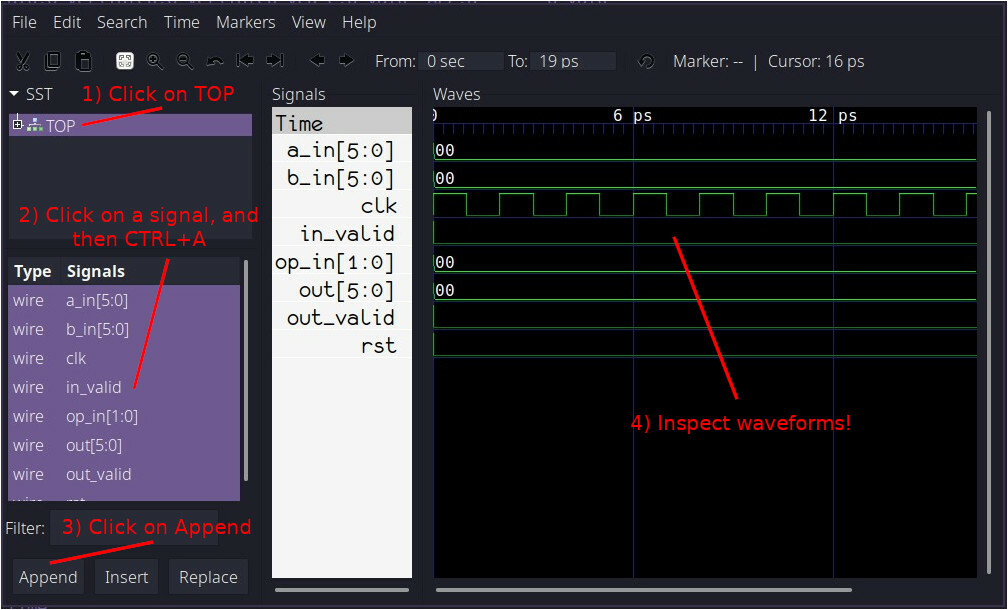 Вызов dut->eval(); оценивает все сигналы в нашем модуле ALU, и m_trace->dump(sim_time); записывает все значения трассируемых сигналов в наш файл дампа сигнала. Как видите, в настоящее время модель оценивается только по частоте.