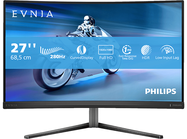Philips Evnia 27M2C5200W оборудован 27-дюймовой Fast VA-матрицей с радиусом изгиба 1500R, благодаря чему обеспечивается панорамный эффект – края экрана равномерно охватывают поле зрения пользователя. Это усиливает погружение в игровой процесс, особенно в шутерах от первого лица и гонках. Разрешение Full HD остаётся оптимальным выбором для тех, кто делает ставку на высокую игровую производительность – через DisplayPort монитор способен достичь до 280 Гц, а по HDMI — до 180 Гц. Такая частота обновления кадров позволяет добиться невероятно плавного геймплея без разрывов и задержки кадров.