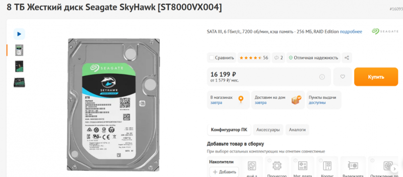 Жесткий диск Seagate SkyHawk на 8 терабайт стоит дешевле, чем Western Digital Purple на 6 терабайт, поэтому выглядит как выгодный вариант для покупки. К тому же, конкретно у этой модели вроде как нет проблем с надежностью – самыми ненадежными, если судить по предоставленной компанией Backblaze статистике, являются накопители серии Exos. Сам бы я предпочел взять WD, но если у вас нет такого негативного настроя по отношению к Seagate, как у меня, обусловленного личным опытом, то рассматриваемый восьмитерабайтник может стать хорошим выбором. К тому же, у меня тоже были жесткие диски Seagate, которые много лет работали без проблем. Но такова уж особенность нашей психики: если техника работает нормально, это воспринимается как должное и не запоминается, а если выходит из строя — это вызывает негативные эмоции и откладывается в памяти.