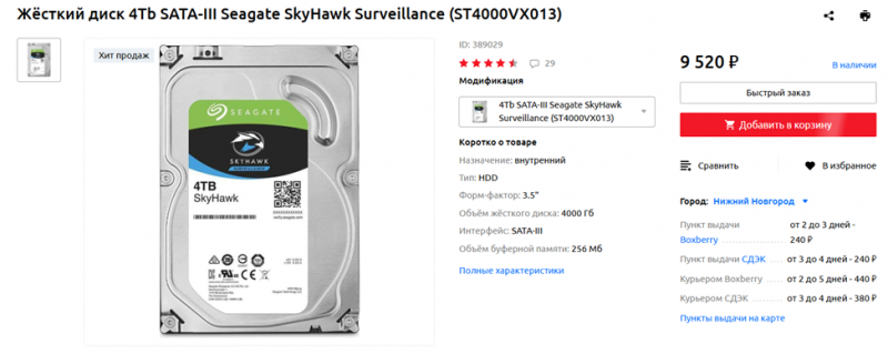 И последний на сегодня жесткий диск — Seagate SkyHawk Surveillance емкостью 4 терабайта. Это вариант для экономичных пользователей, не готовых сейчас отдавать за накопитель более 10 тысяч рублей. Модель отличается неплохими скоростными характеристиками, высокой надежностью и низким уровнем шума, а также скромным энергопотреблением, не превышающим 4 Вт. На маркетплейсах этот жесткий диск можно приобрести еще дешевле, чем в магазинах, особенно, если пользоваться скидками, промокодами и акциями. Только смотрите отзывы о продавце, и уточняйте, как долго магазин присутствует на площадке, чтобы не купить бывший в употреблении HDD под видом нового.