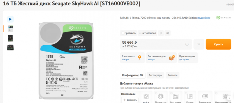 С точки зрения стоимости одного гигабайта Seagate SkyHawk AI на 16 терабайт еще выгоднее, чем WD Purple Pro на 18, при этом оба диска формально предназначены для систем видеонаблюдения, обладают гелиевым наполнением и используют традиционный, а не черепичный тип записи. Как я уже говорил, в среднем по статистике жесткие диски Seagate менее надежны, чем решения WD, но разница эта незначительна, если исключить из сравнения несколько моделей с маркировкой NM из линейки Exos. Так что брать Seagate SkyHawk можно, если вы не храните на нем ценные для вас данные в единственном экземпляре. Вообще, не пренебрегайте бэкапами — пока накопители еще не подорожали, стоит купить пару штук, да и облачные хранилища тоже актуальны.
