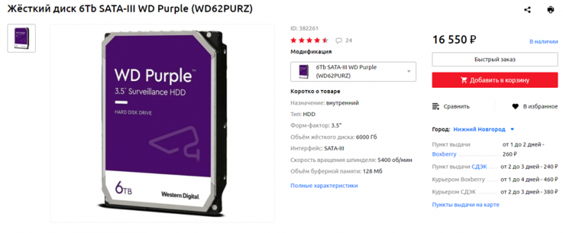 Если вы не готовы отдавать за жесткий диск более 16-17 тысяч рублей, то хорошим выбором будет модель Western Digital Purple на 6 терабайт с индексом WD62PURZ. Это надежный, тихий и проверенный временем накопитель, который часто приобретают для систем видеонаблюдения, а также домашних компьютеров – например, для хранения коллекций фильмов, музыки и сериалов, либо рабочих материалов. Конечно, с точки зрения стоимости одного гигабайта выгодно брать более емкие накопители на 16-18 терабайт, но не всем нужен такой объем, и не все готовы приобретать HDD по такой цене.