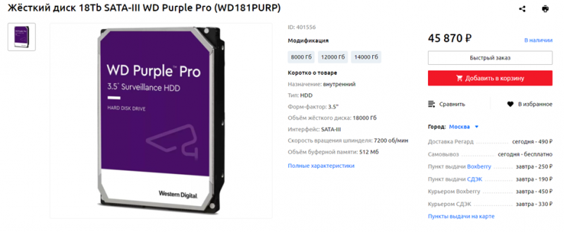 Что ж, переходим непосредственно к выбранным мной жестким дискам. Открывает подборку 18-терабайтная модель Western Digital Purple Pro. Стоит она по нынешним меркам не то, чтобы дорого — 44-46 тысяч рублей. Как бюджетная игровая видеокарта. И этим стоит пользоваться, поскольку, по оценкам аналитиков TrendForce, жесткие диски в 2024 году подорожают как минимум на 20-25%. Как минимум! Твердотельные накопители вырастут в цене еще сильнее — вероятно, на 30-40%. Если же реализуется наихудший сценарий – например, повторение землетрясений на Тайване с повреждением оборудования и заготовок, то подорожание может превысить 50%.