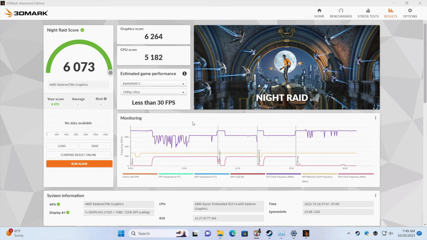 Первым делом блогер оценил производительность мини-ПК в синтетических бенчмарках 3DMark. В итоге интегрированная графика Ryzen Embedded R2514 набрала 3363 балла в 3DMark Wild Life и 6264 балла в 3DMark Night Raid.