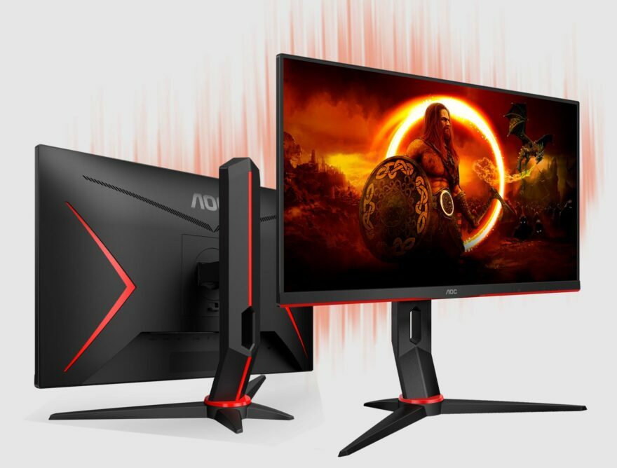 На тыльной стороне изображен логотип компании AOC, расположена решетка для вентиляции и имеются ярко красные клиновидные вставки, которые создают агрессивный контраст, характерный для игровых моделей.