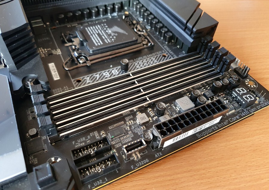 Слотов для оперативной памяти на Gigabyte Z790 Aorus Master X традиционно четыре. Все они армированы и предназначены для планок стандарта DDR-5, общий объем которых может достигать 256 гигабайт, то есть до 64 гигабайт на слот. Официально для платы указана поддержка модулей с частотой до скромных 4800 мегагерц, но это из-за традиционно небыстрого принятия новых стандартов JEDEC. По факту, с использованием профилей XMP или при ручной настройке, обеспечена поддержка планок с частотой до 8266 мегагерц.