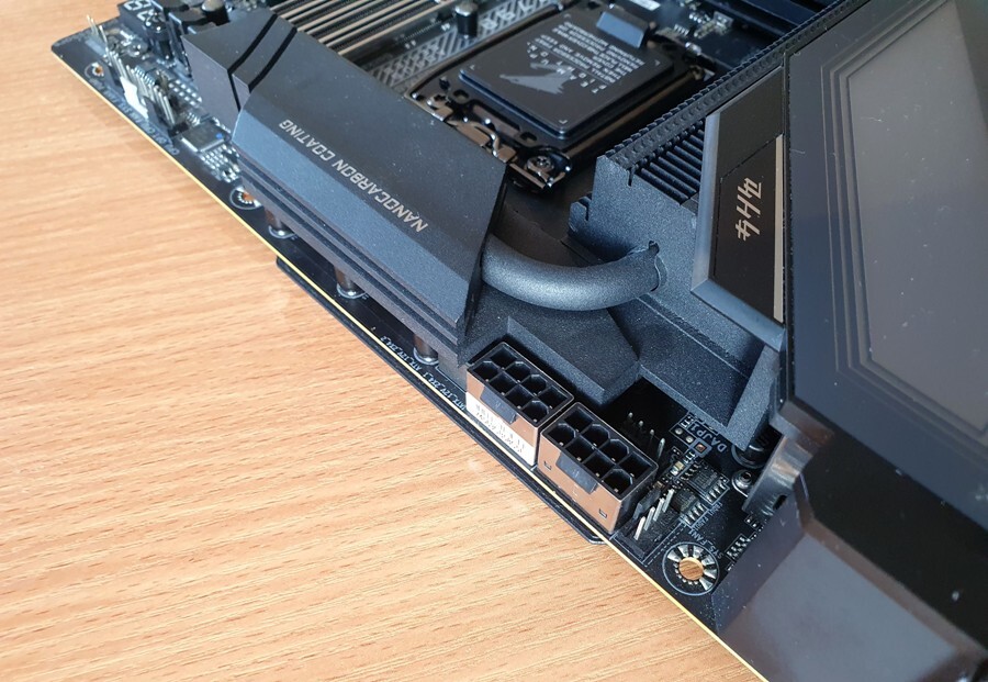 А все потому, что под парой крупных радиаторов с нанокарбоновым покрытием, «связанных» тепловой трубкой, сверху и слева от процессорного разъема, спряталась мощнейшая 23-фазная система питания. И это честные, а не маркетинговые фазы — без удвоителей и прочих хитростей. Из 23 фаз 20 предназначены для питания непосредственно процессорных ядер, еще пара выделена для интегрированной графики и одна работает на встроенный контроллер оперативной памяти и контроллера PCI-Express. Такая система питания без проблем обеспечит прожорливые топовые Core стабильным питанием не только на максимальных стандартных частотах, когда потребление процессоров стремится к значению 300 ватт, но и в разгоне.