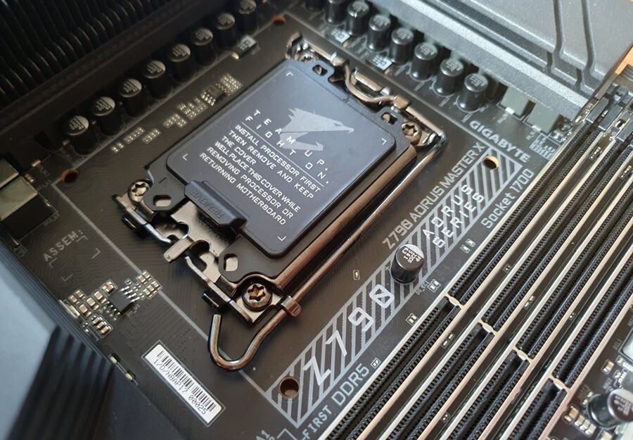 Впрочем, начнем с базовых вещей. В основе платы, как понятно из названия, лежит топовый чипсет Intel Z790, который поддерживает работу с процессорами Core c 12-го по 14-е поколения, соответственно, в центре верхней части платы мы видим процессорный разъем LGA-1700. Каких-либо ограничений по моделям используемых процессоров у Gigabyte Z790 Aorus Master X нет — даже самые прожорливые Core i9 будут чувствовать себя здесь прекрасно и не ощутят каких-либо ограничений по потребляемой энергии.