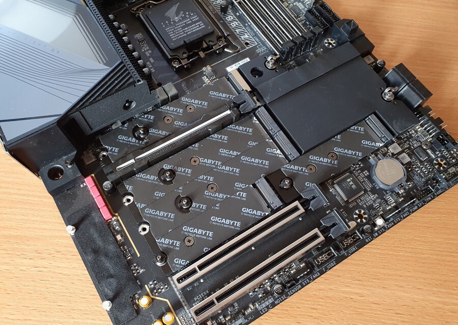 Учитывая, что накопители, равно как чипсет и цепи питания процессора, являются одними из самых горячих частей платы, не удивительно, что в Gigabyte Z790 Aorus Master X уделили максимум внимания их охлаждению. Разъему, который готов принять накопитель с интерфейсом PCIe 5.0, выделен личный огромный радиатор, который должен справиться даже с самыми жаркими SSD. Остальные накрыты одним общим радиатором, который также является и фиксатором для накопителей — никаких больше ультрамаленьких винтов! Что интересно, сам радиатор тоже имеет быстросъемное крепление и термопрокладки для каждого SSD. Более того, под накопителями тоже установлен радиатор с термопрокладками для отвода тепла от нижней части SSD. Да, они, конечно, отводят тепло в сторону платы, но и тут его есть куда девать — практически вся задняя часть Gigabyte Z790 Aorus Master X прикрыта огромным радиатором, который решает эту проблему.