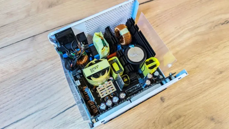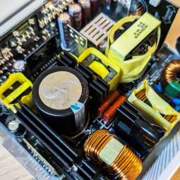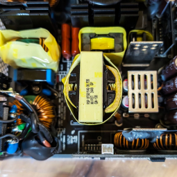 Устройство имеет современную конструкцию с полумостовой топологией на первичной стороне и резонансным LLC-преобразователем для коммутации без потерь. Шесть полевых транзисторов Toshiba обеспечивают питание 12 В на вторичной стороне, а пара ШИМ-контроллеров генерирует вспомогательные напряжения. Вся компонентная база — от известных своей надежностью и качеством брендов, так что тут трудно найти что-то, до чего можно было бы докопаться.
