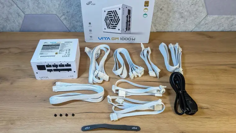 Номинальная мощность FSP VITA GM 1000W, как нетрудно понять из названия, 1000Вт, а сертификат — 80+ Gold. Заявлено полное соотвествие стандартам ATX v3.1, что означает сопротивление пульсациям вплоть до двойного номинала. Также по 16-ти контактному разъему для питания видеокарты возможна подача мощностью до 600Вт. Так что да, любая комбинация из комплектующих, доступная для покупки в магазине, этим блоком питания поддерживается. Исключением могут стать только системы с двумя флагманскими видеокартами. Но это уже не игровой или домашний компьютер, а рабочая станция и для них у FSP есть линейка MEGA TI с номиналами до 1650 Вт.