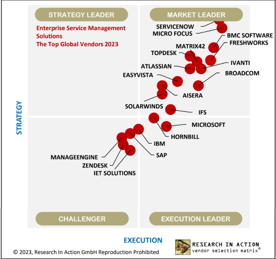 В марте 2023 года аналитики Research in Action поставили компанию на самое почетное место в своей Матрице выбора вендоров решений Enterprise Service Management (ESM).