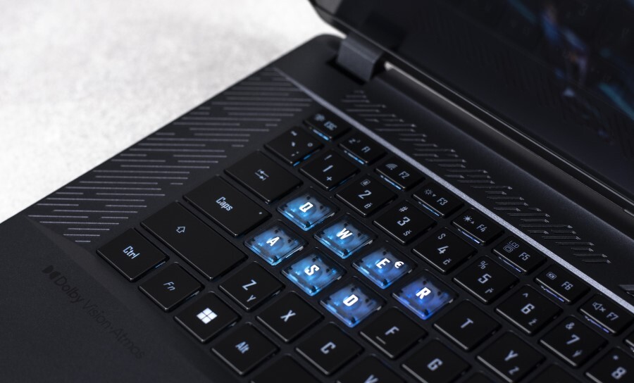Клавиатура — это еще одна деталь, над которой проведена большая работа — тут не только упомянутая RGB-подсветка, но и бесшумный механизм (точнее, малошумный), то есть, клавиши практически не издают звук при клике (ход 1,7 мм). Выделенные «геймерские» клавиши пропустить, конечно, очень сложно — они полупрозрачные, кроме того, для них доступны кастомные настройки.