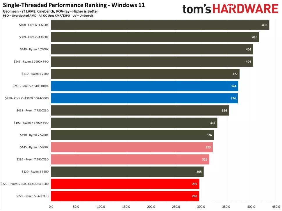 В бенчмарках и прикладных задачах у Ryzen 5 5600X3D не всё так радужно, что и немудрено, учитывая его сниженные тактовые частоты и меньшее количество ядер по сравнению с соперником из стана Intel — в однопоточных/многопоточных задачах новинка уступает Core i5-13400 в среднем 20.9 %/26.0 %.