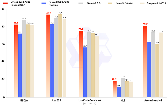 Согласно представленным результатам тестов, обновлённая Qwen 3 Thinking сравнялась с актуальной версией DeepSeek R1 в тесте GPQA, а также вышла вперёд в тестах AIME и LiveCodeBench. Последние проверяют решение математических олимпиадных задач и сложных задач программирования соответственно.