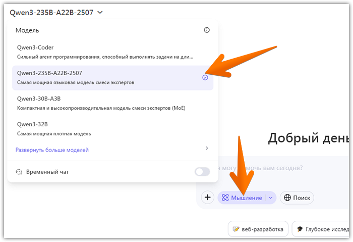 Выбор нужной модели и режима мышления в Qwen Chat.