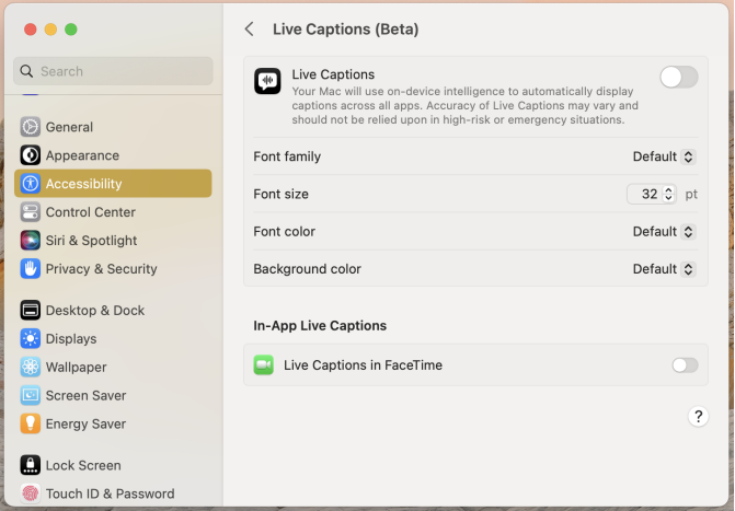Независимо от того, являетесь ли вы глухим, слабослышащим или просто сидите в шумном месте, вы оцените способность macOS Ventura создавать звуковые субтитры в реальном времени. Вы можете включить их, перейдя в настройки специальных возможностей вашего компьютера (находятся в Системных настройках) и войдите в меню Live Captions. После включения Live Captions вы можете настроить шрифт, размер и цвет субтитров. Вы можете применить эти настройки к звонкам FaceTime, используя дополнительный переключатель в нижней части окна специальных возможностей.