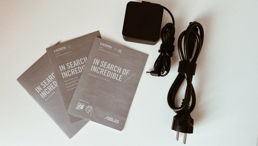По традиции заглянем внутрь коробки. Здесь нас ждет минимально-необходимая комплектация, состоящая из адаптера на 90 Вт и шнура для подзарядки, стандартного мануала от ASUS и, конечно же, сам ноутбук.