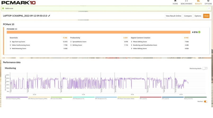 Уже привычный для нас бенчмарк PCMARK 10 сработал в унисон с мнением эксперта и показал хорошую (а для офисного девайса — отличную) производительность в 4816 баллов!