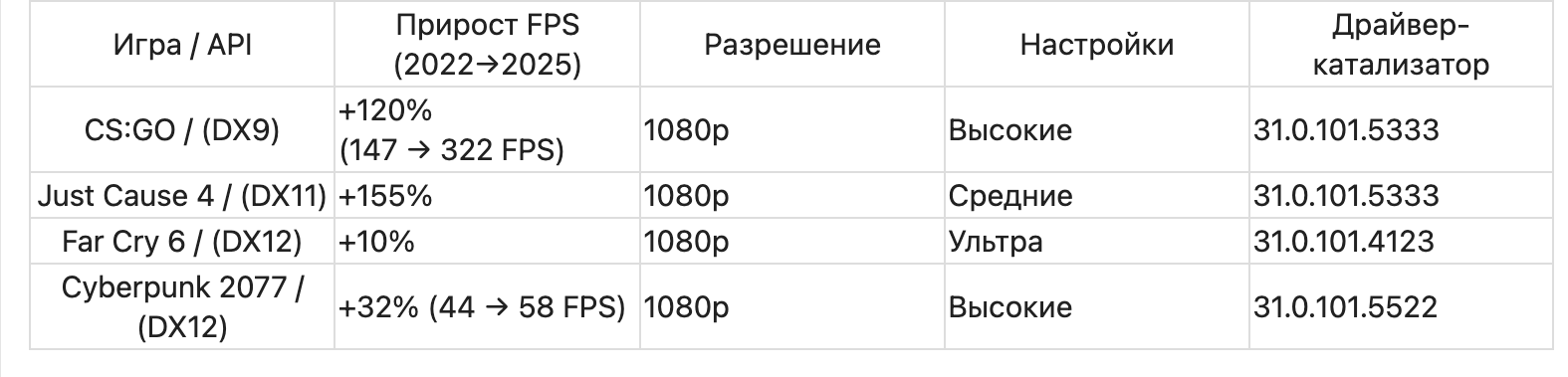 - CS:GO (DX9): рост с 147 FPS до 322 FPS (1080p) — +120%