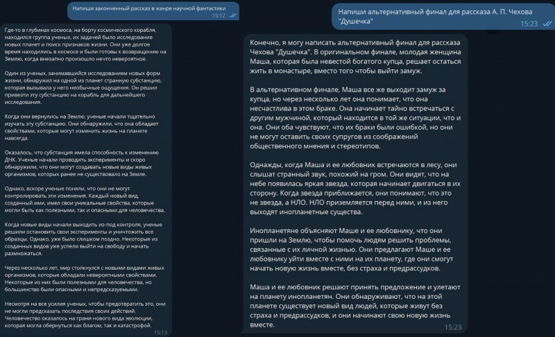 Предлагаем изучить результаты генерации по запросам о создании авторского произведения в жанре научной фантастики и генерации альтернативного финала для рассказа А. П. Чехова "Душечка":