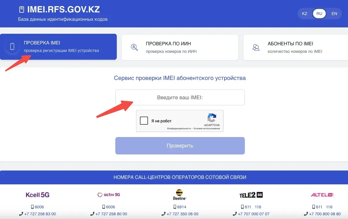 На данный момент система (IMEI.RFS.GOV.KZ) работает следующим образом: