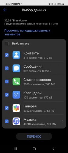 Теперь выбираем данные для переноса на старом телефоне. Это могут быть контакты, сообщения, список вызовов, фотографии, видео, документы и даже приложения. Мы выбрали всякого на 33 ГБ с хвостиком. Одних только фотографий и видео было более 5 тыс. единиц суммарным объемом 27,65 ГБ. А приложений – 74 штуки примерно на 4 ГБ. Теперь нужно лишь нажать на кнопку «Перенос» и дождаться, когда завершится процесс.
