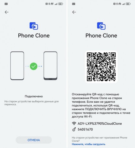 На экране Huawei Pura 70 опять появился QR-код. Но уже другой. Сканируем его старым телефоном, чтобы подключить устройства друг к другу. На этом этапе Phone Clone создает временную Wi-Fi сеть, которая и позволяет быстро перенести данные.