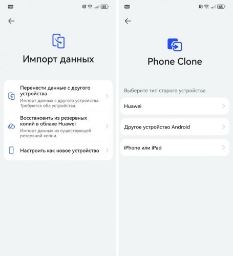 Интересно, что в случае с Huawei Pura 70 приложение скачивать не пришлось, ибо оно уже «вшито» в систему. Причем уже на этапе первого запуска смартфон сам предложил перенести данные. И мы выбрали соответствующую функцию на этапе «Импорт данных», а затем указали тип старого устройства. В нашем случае это было «Другое устройство на Android».