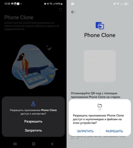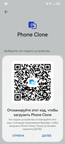 Появилось окошко с QR-кодом, с помощью которого можно загрузить Phone Сlone на старое устройство. Но оно уже у нас там стоит, поэтому данный этап мы пропустили.