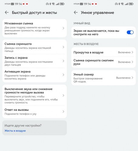 Отдельного внимания заслуживает функция управления жестами, которых предусмотрено довольно много. Настроить их можно, пройдя по следующему пути: Настройки – Специальные возможности – Быстрый доступ и жесты. И сразу будет доступен большой список. А если внизу еще нажать на «Жесты в воздухе», то откроются и дополнительные опции.