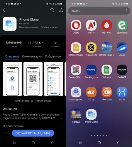 Сначала мы установили и запустили Phone Clone на обоих смартфонах. Если запускать с рабочего стола, то на старом телефоне нужно выбрать опцию «Это старый телефон», на новом – «Это новый телефон».